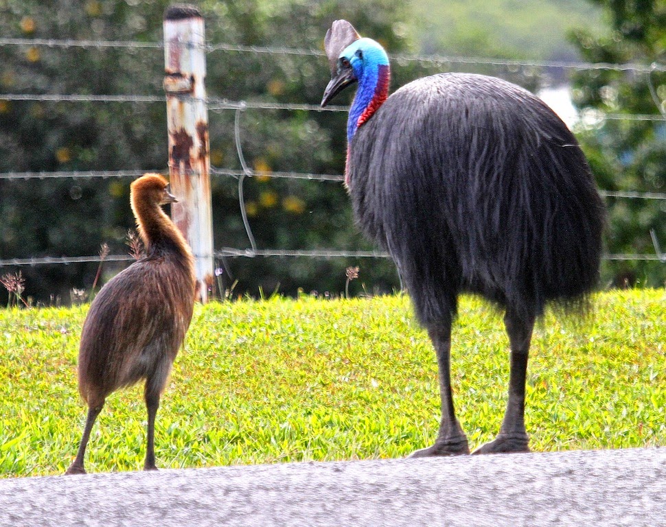 I was driving home from a quick early morning trip to town when I saw cassowary Hagar standing in the middle of the road, at the top of the hill. A screech to stop and I jumped out of the car with my camera. I saw that Rainbow was with his dad Hagar, he had been hidden by the rise of the road. Hagar was plucking angrily at his feathers while Rainbow was walking toward the fence.